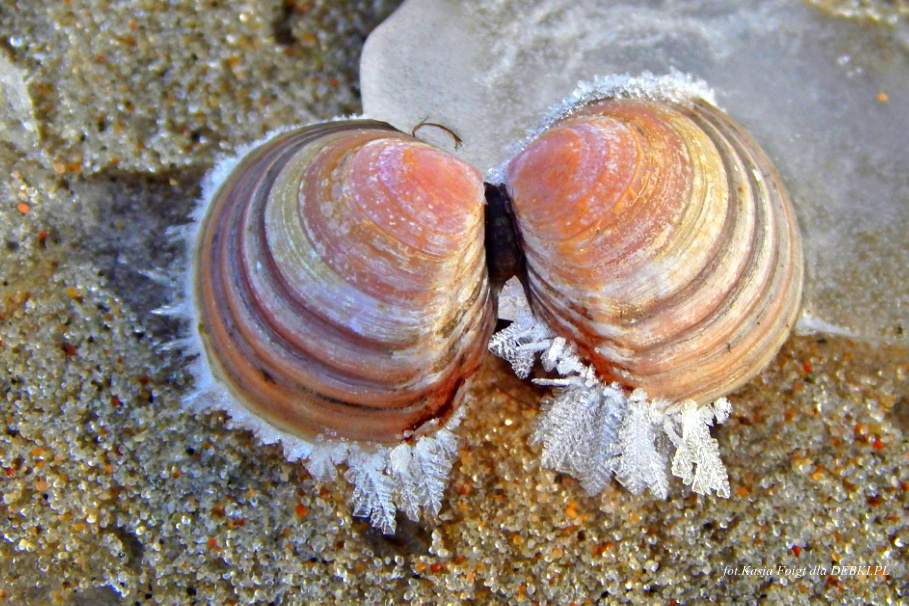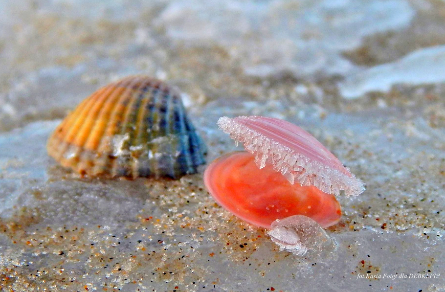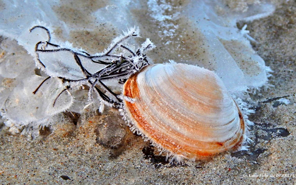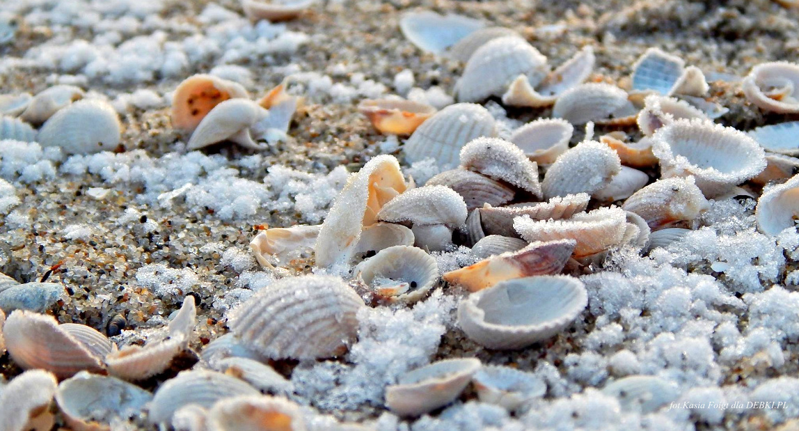 Zimą na plaży w cale nie musi być nudno, możesz szukać pięknych, ozdobionych mrozem muszelek.
