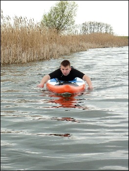 KROK 3: Chwyć leżące na desce wiosło i podeprzyj się nim z przodu.